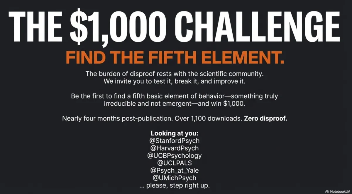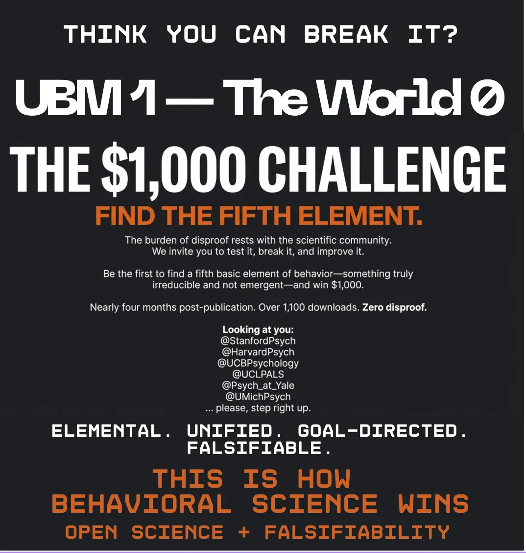 UBM’s structure is falsifiable: it asserts that no fifth elemental component is required to describe, influence, or modify human behavior. This core claim invites empirical testing through the open “No 5th Element” Challenge.