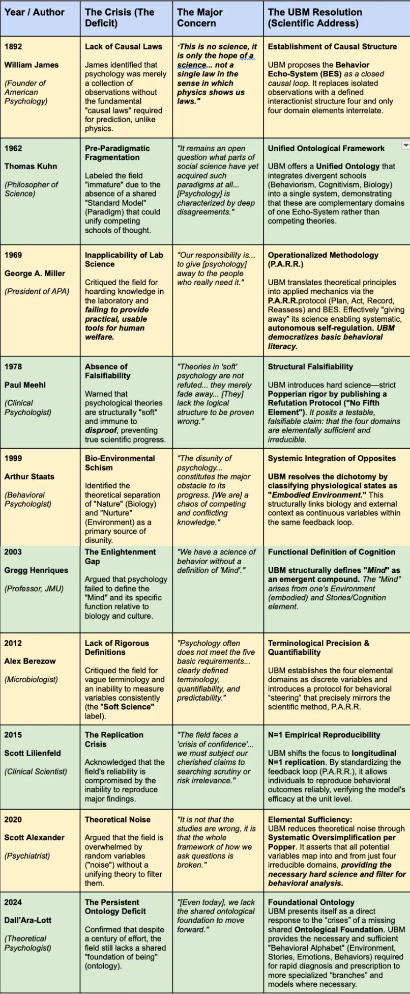 The Unified Behavior Model (UBM) directly addresses this systemic deficit. By offering a unified, elemental, and falsifiable structure, UBM is positioned to finally establish enduring theoretical coherence across the breadth of the behavioral sciences.