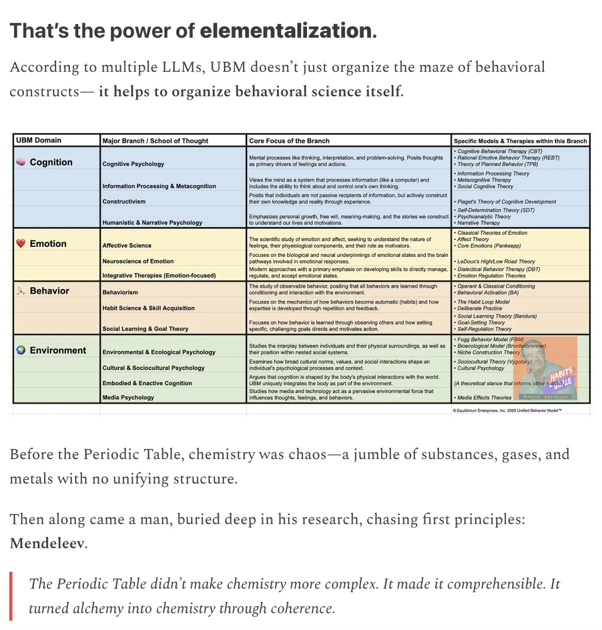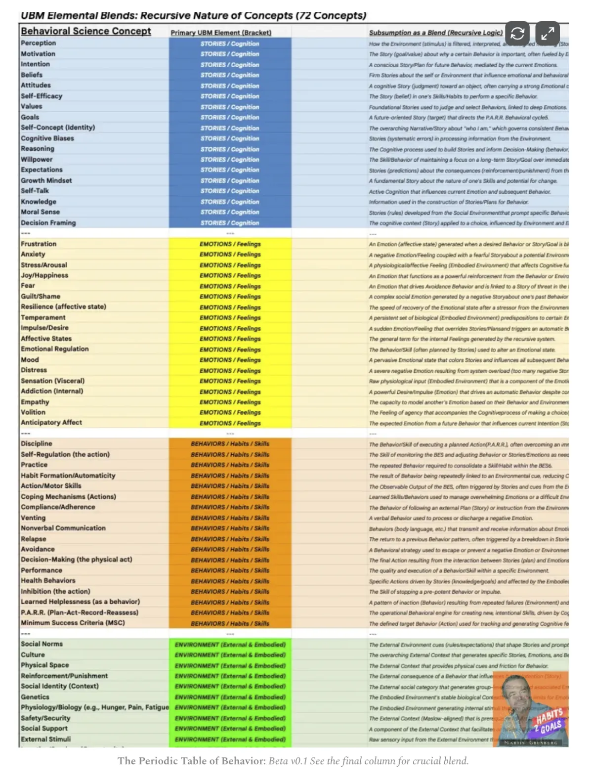 Unified Behavior Model (UBM) preprint: (7/8/2025): The Unified Behavior Model (UBM) addresses both by elementalizing behavior into four components: Cognition (stories/narratives), Behavior (habits/skills), Emotion (feelings as dynamic conduits), and Environment (including the body). This four-element “Behavior Echo-System” is explicitly falsifiable: any proposed fifth component must be shown to be both irreducible and essential.